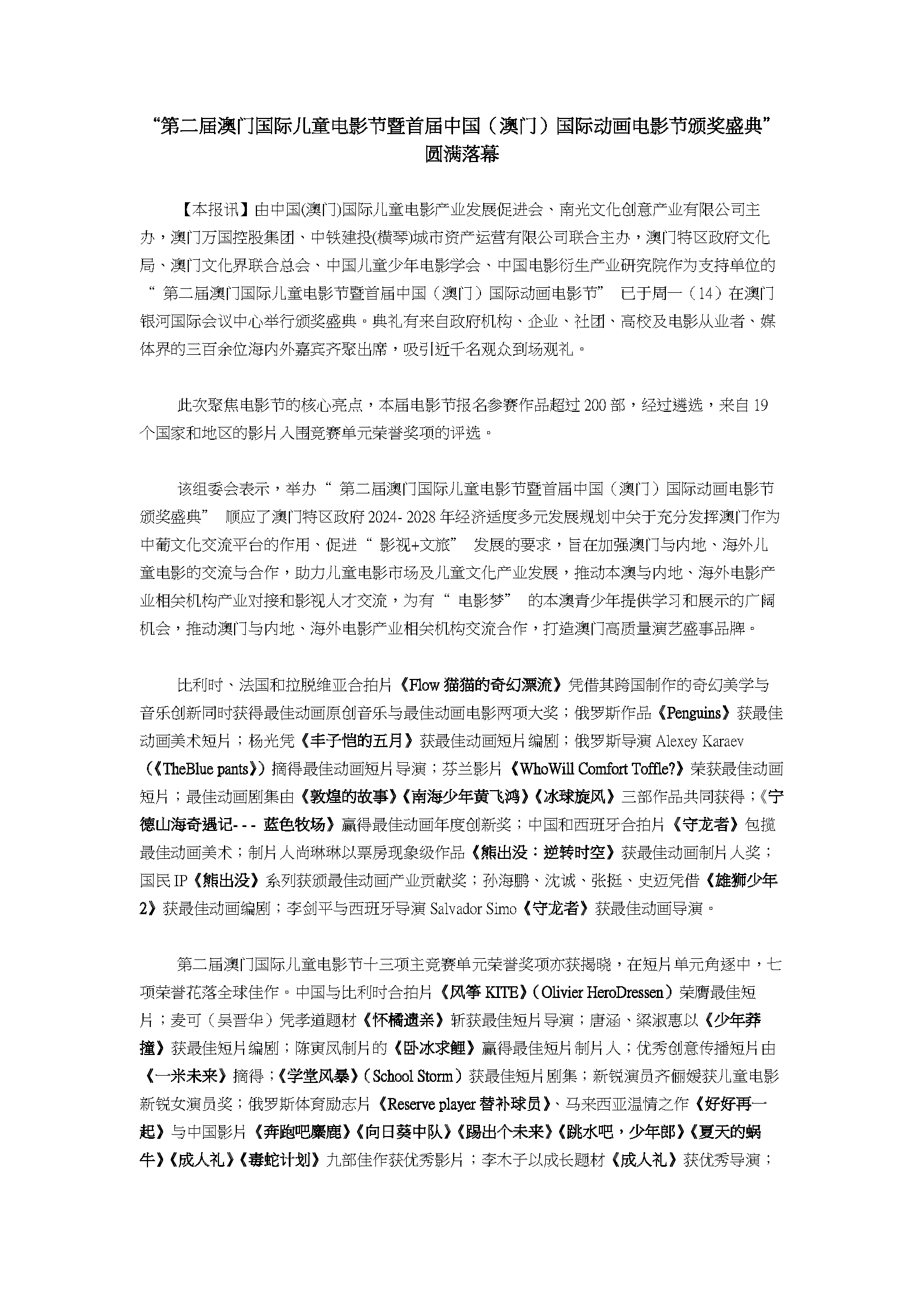 “第二届澳门国际儿童电影节暨首届中国(澳门)国际动画电影节颁奖盛典”圆满落幕