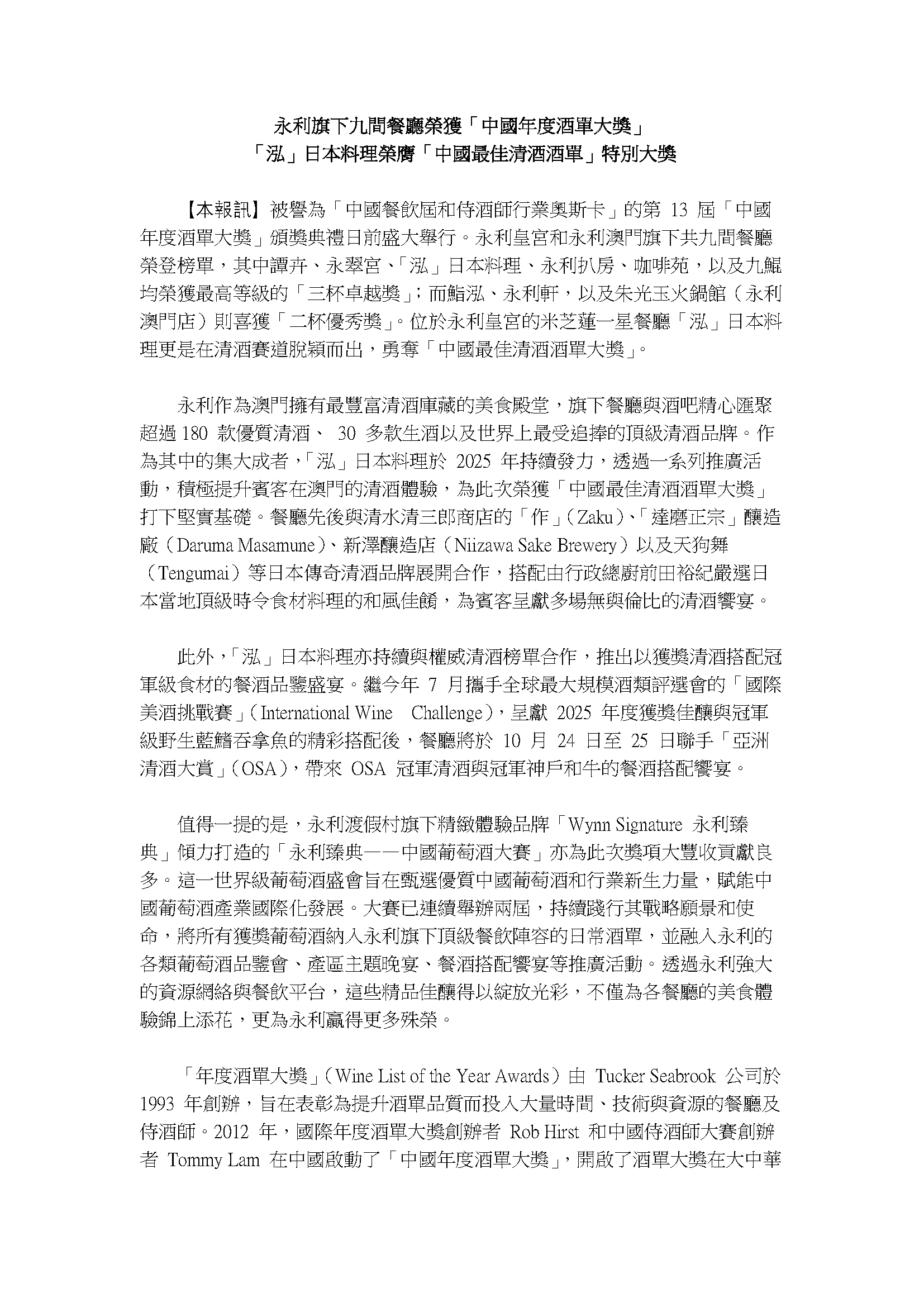 永利旗下九間餐廳榮獲「中國年度酒單大獎」